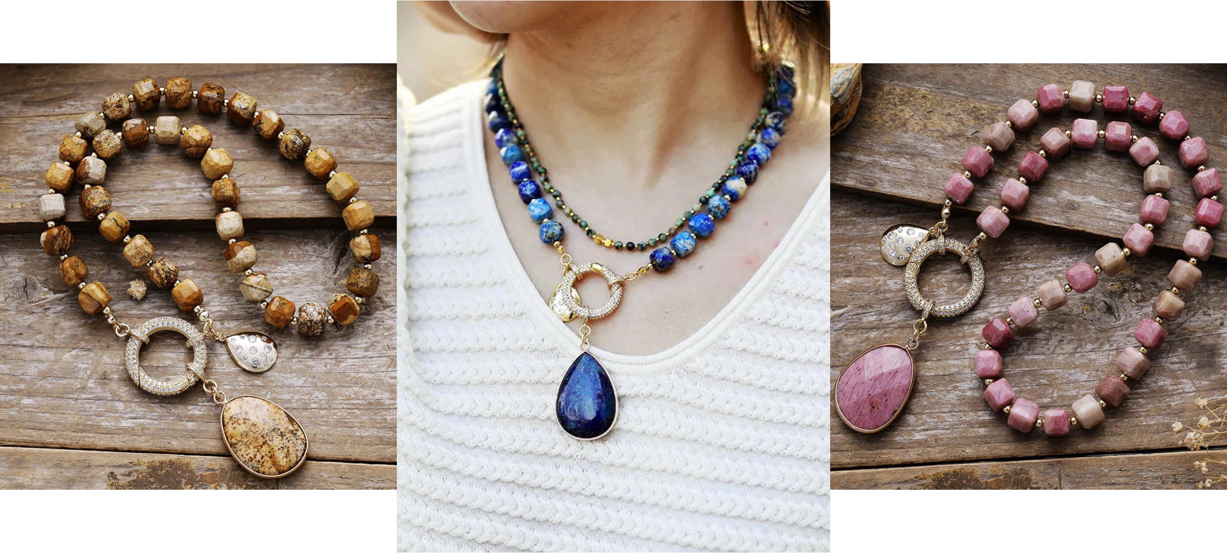 I have recently been gifted by my husband, two necklaces for my birthday in December, a green quartz and agate pave necklace and a stunning amethyst pave necklace, plus a lava stone and labradorite and jasper Apple wrap watch band. I loved them so much, I purchased more gorgeous items. A mixed quartz beaded choker necklace, a lapis lazuli heart pendant and a gorgeous lapis lazuli charm and jasper wrap bracelet. I am absolutely delighted with the quality of workmanship and beauty of these natural stones and receive many admiring comments.